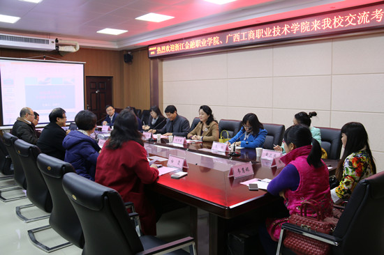11月13日下午,浙江金融职业学院马克思主义学院院长曲士英、广西工商职业技术学院社科部主任刘万英等一行9人到必赢官网考察交流。必赢官网党委副书记、副校长王卫东,教务处长焦爱萍,思想政治理论教学部主任彭新立、副主任白霞及相关教师等在5号实训馆会议室热情接待了来访客人。交流会由白霞主持。