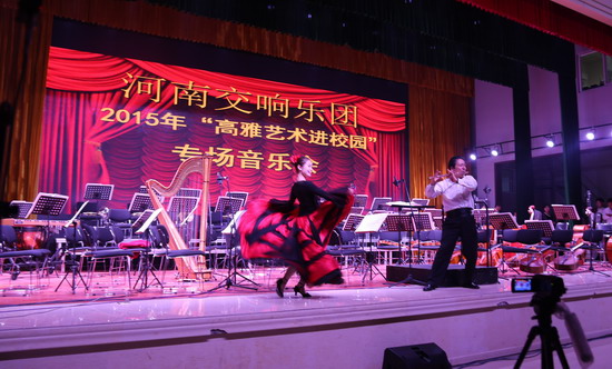 演出在世界经典歌剧《卡门》序曲中拉开帷幕,优美的旋律把在场师生带入高雅音乐殿堂。乐团先后演奏了我国芭蕾舞剧《红色娘子军》组曲选段、俄国著名作曲家柴可夫斯基的《天鹅湖》、英国作曲家奥尔福德的《波基上校》、新疆民歌《掀起你的盖头来》以及经典动漫《龙猫》、《风之谷》的音乐插曲等一系列大家耳熟能详的中外经典乐曲,忽而振奋激昂似万马奔腾,忽而低声细语似空谷幽兰,美不胜收。其中由河南著名女高音王园园演唱的具有浓郁特色的地方民歌《茉莉花》、《龙船调》,由国家一级长笛大师董世英演奏、艺术系学生张培培伴舞的长笛情景独奏把音乐会推向高潮。