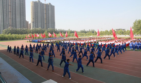 会场士气高昂,秩序井然,在各方队嘹亮的口号声中,党委副书记、院长刘国际在军训教官的陪同下检阅了2013级新生各军训方队。随后,以连队番号命名的各方队分别进行了精彩的队列和军体拳方阵汇报表演,他们以整齐的军容和昂扬的士气,展示了良好的精神面貌与高昂的斗志,向学院和承训部队首长展示了军训的成果。