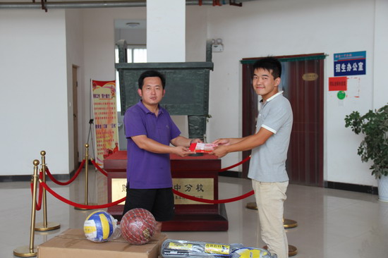 7月3日下午,邢二朋带着一万元奖金和学院捐赠的价值近3000元的篮球、排球等体育用品,在院学生处副处长王国英、院团委副书记李聪、系党总支副书记焦东良、分团委书记朱玮和辅导员史晋的陪同下来到浚县一中举行捐赠仪式,并与浚县一中副校长黄建太、教导处副主任兼团委副书记杨云海和部分学生代表进行了座谈。