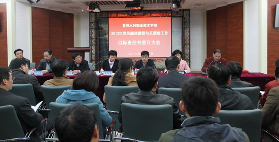 3月20日下午,我院在4号实训馆演播大厅召开新学期中层干部会议,安排部署2013年度学院党政工作任务,签订党风廉政建设与反腐败工作目标责任书。院领导张惠贞、刘国际、茹正波、刘紫婷、杨士恒、张豫东、刘卫锋出席会议,全体中层干部参加会议。会议由院党委书记张惠贞主持。