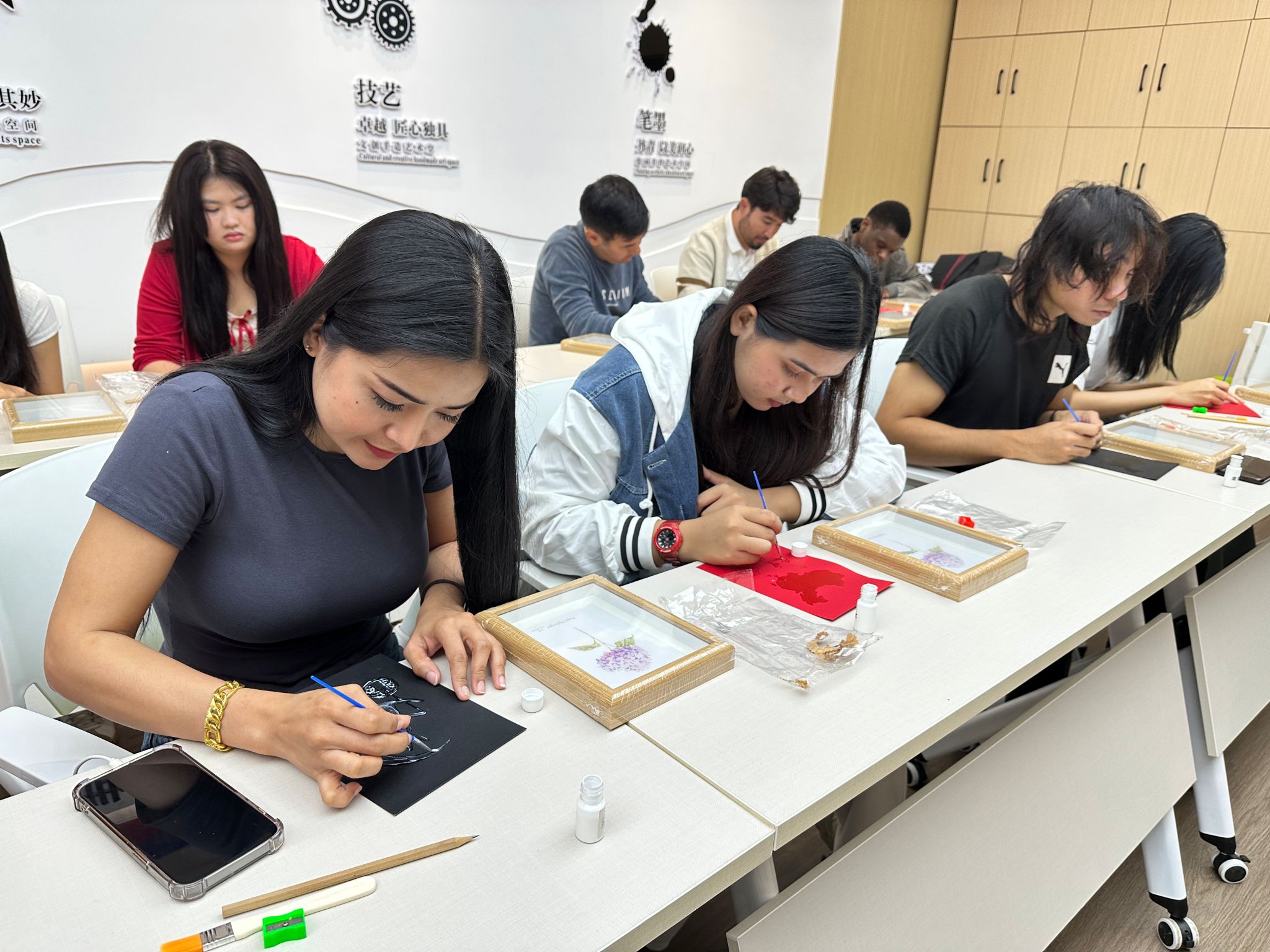 活动现场设置了三大非遗体验区。在漆扇绘制区,中外学生协同创作,中国学生细致讲解传统漆艺,留学生巧妙运用金箔、彩漆点缀扇面,融入明月、桂花等中秋意象;金箔画制作区,参与者共同贴箔、勾勒,融合东方意境与现代创意;木版画区则分工协作,雕刻、拓印有序进行,共同完成以团圆为主题的版画作品。整场活动气氛热烈,中外学子在互动中深入体验中华传统工艺的独特魅力。
