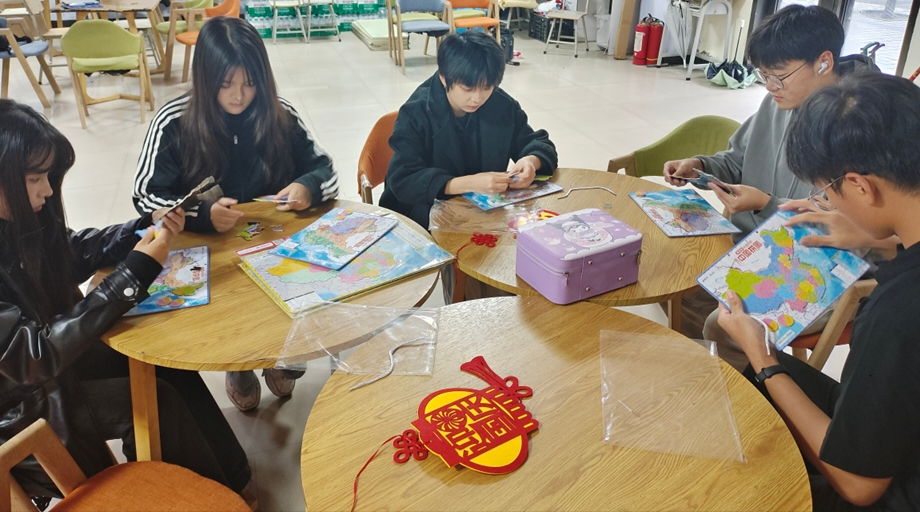 在“赓续薪火·红色记忆永流传”主题活动中,同学们通过多种形式传承红色基因。“山河入画”拼图环节中,同学们协作完成中国地图拼接,深化对祖国疆域的认知;“脸谱绘华章”活动融合京剧艺术与爱国主义教育,同学们绘制具有象征意义的纹样,体会民族文化底蕴;“我与国旗合影”活动吸引大批学子参与,展现了新时代青年的坚定信念。
