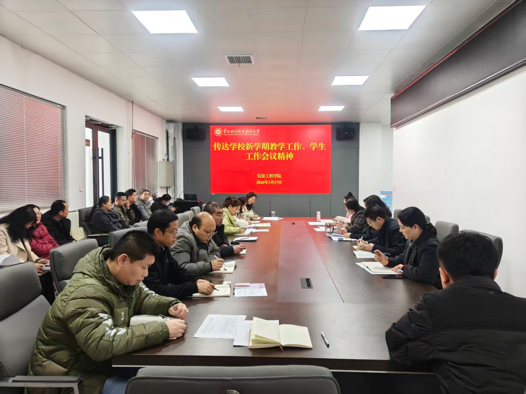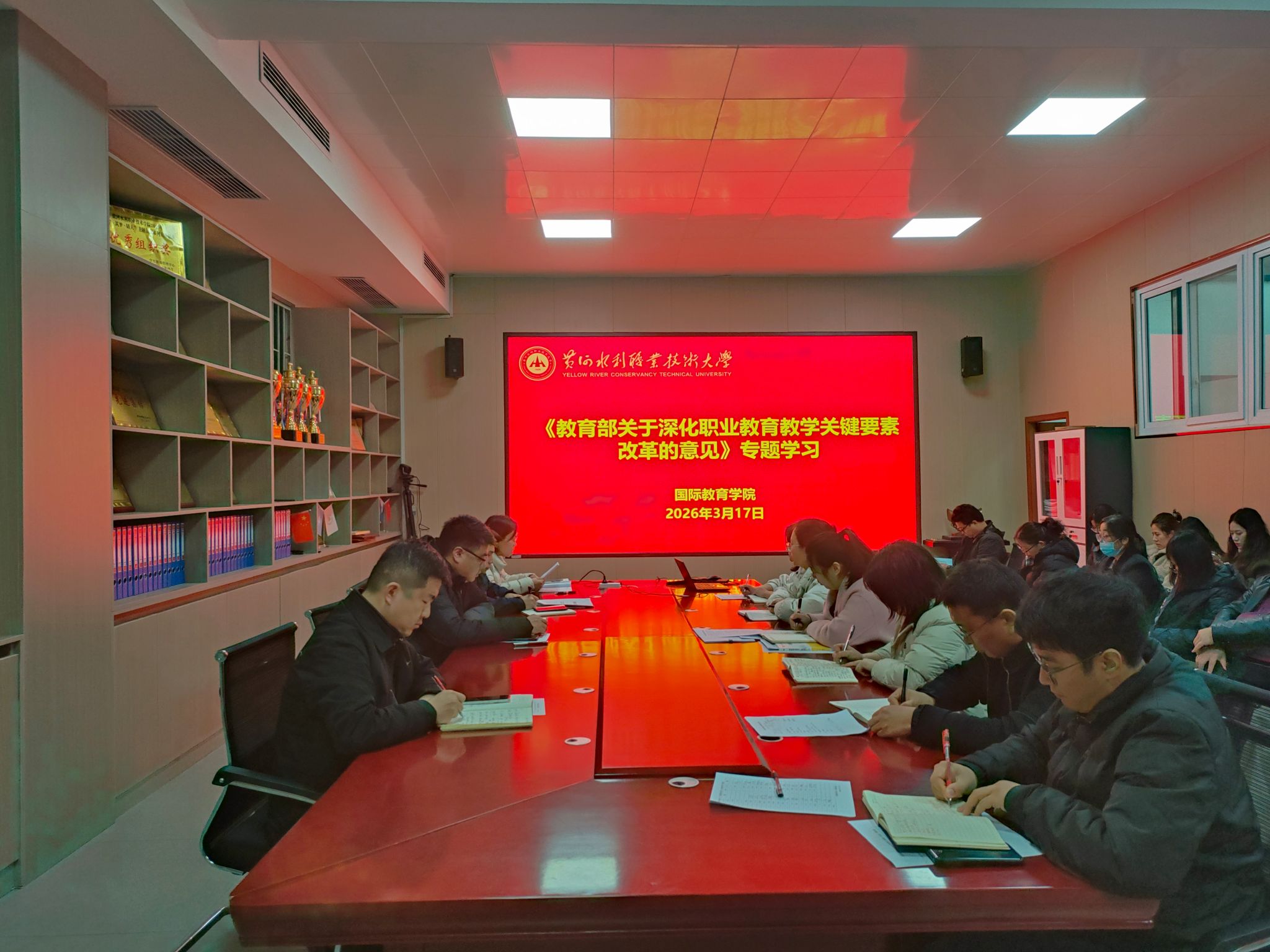 为贯彻落实《黄河水利职业技术大学2026年上半年教职工政治理论学习及思想道德教育计划》学习要求,3月17日,全校各部门、各单位分别组织教职工传达学习学校2026年度工作务虚会精神,学校新学期教学工作、学生工作会议精神,2026 年全国两会精神和《教育部关于深化职业教育教学关键要素改革的意见》,引导全校教师坚持以习近平新时代中国特色社会主义思想为指导,深入贯彻党的二十大和二十届历次全会及全国教育大会精神,落实立德树人根本任务,为推动教育高质量发展、建设教育强国贡献力量。(供图:各相关部门)