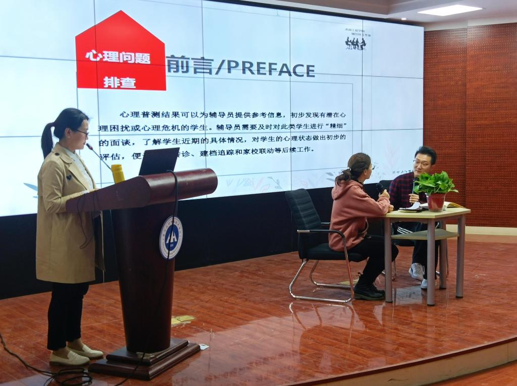 水利工程学院心理指导老师赵诗捷就如何与筛查出来的可能存在心理问题的学生做个别访谈,进行了专业指导,提供了结构化的访谈建议,印发了相关材料及记录模板,以便辅导员开展访谈工作。同时,结合学生真实典型案例,由新入职辅导员徐剑飞、李瑞老师现场“模拟咨询”,对心理咨询中的倾听、提问等摄入性会谈技巧和尊重、共情、积极关注等心理咨询技能进行实际的操作和探讨。最后,以此案例为题,老师们又结合辅导员素质能力大赛的要求进行了案例分析题目的练习。