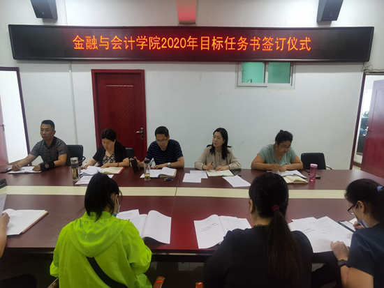 6月16日上午,金融与会计学院在SY5412会议室召开2020年度“双高校”建设工作推进会暨目标任务书签订仪式,该学院领导班子成员、全体科级以上干部参加会议,会议由金融与会计学院院长宋建涛主持。该学院党总支办、行政办、校企合作办主任,各教研室主任与该学院领导签订了2020年目标任务书。