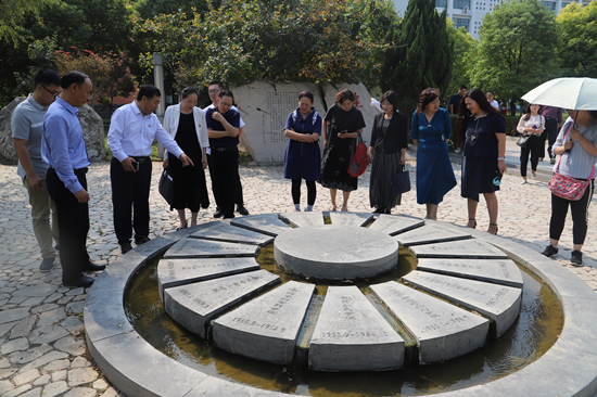 座谈会后,吴晓红一行在党政办、宣传部、教务处等职能部门以及相关学院负责人陪同下,考察了“足迹”文化景观和实训场馆。