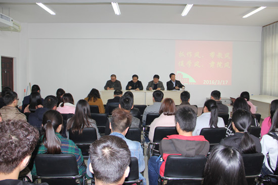 3月17日下午,水利工程学院在5号实训馆5310室召开了“抓作风、带教风、促学风、肃院风”教学工作会议。该学院领导、科级干部及全体教研室主任、全体辅导员、在校班级学习委员等参加会议。会议由该学院党总支副书记楚万强主持。