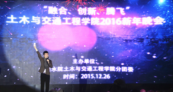 12月26日晚,土木与交通工程学院举办的以“融合、创新、腾飞”为主题的2016新年晚会在学生活动中心华丽上演。该学院师生观看了本次晚会。