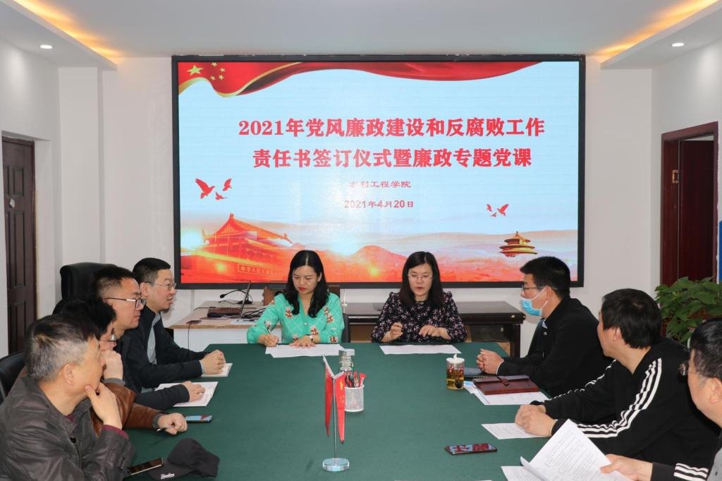 为切实加强党风廉政建设和反腐败工作,2021年4月20日,水利工程学院党总支在SY5312举行2021年党风廉政建设和反腐败工作责任书签订仪式暨廉政专题党课。院党总支书记孙天星、院长陶永霞分别和分管领导和部门现场签订了2021年党风廉政建设和反腐败工作责任书。