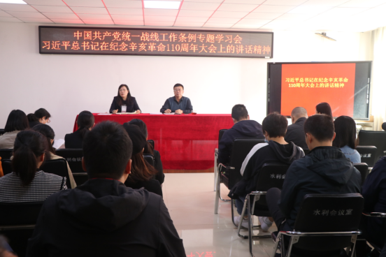 10月12日下午,水利工程学院组织召开专题学习会,深入学习《中国共产党统一战线工作条例》和习近平总书记在纪念辛亥革命110周年大会上的讲话精神。学院党总支书记孙天星、院长陶永霞及全院教职工参加了会议。会议由孙天星主持。