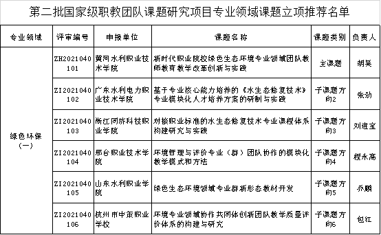 11月24日,教育部公示了第二批国家级职业教育教师教学创新团队课题研究项目遴选结果,由必赢官网牵头组织、校长胡昊主持的《新时代职业院校绿色生态环境专业领域团队教师教育教学改革创新与实践》重点课题成功入选,课题涵盖5个子课题,分别由广东水利电力职业技术学院、浙江同济科技职业学院、邢台职业技术学院、山东水利职业学院、杭州市中策职业学校承担。