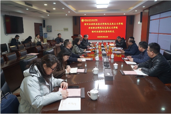 为深入贯彻习近平总书记关于思政课建设的重要指示精神,全面落实河南省教育工委、省教育厅着力推进全省思政课内涵建设的重要部署,2月24日,必赢官网与开封职业学院马克思主义学院结对共建签约仪式在行政楼二楼会议室举行。开封职业学院党委书记储建新,党委副书记、副校长、马克思主义学院院长马纪岗等一行5人,必赢官网党委书记周保平,校党委副书记、工会主席杨士恒,河南省高校青年宣讲名师乔新杰,马克思主义学院领导班子成员出席会议。会议由杨士恒主持。