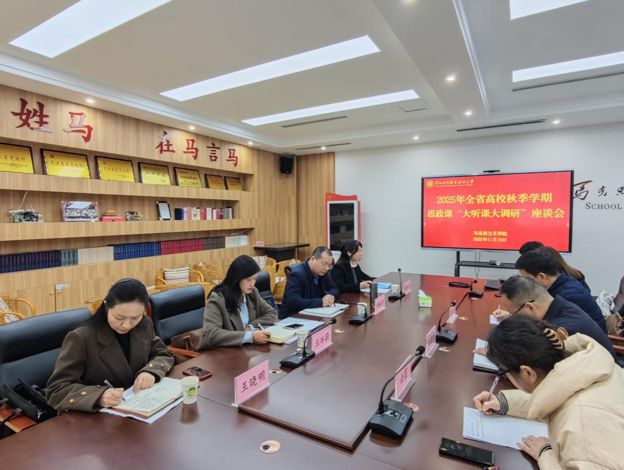 随后,调研组召开马院部分教师座谈会,对听课情况和相关课程建设进行进一步指导。调研组认为,四位教师在教学内容设计、教学方法运用、课堂互动安排等方面各有亮点,整体教学效果良好。为了进一步提升教学效果,建议进一步调查学情、教情,梳理学生角度的问题清单,并结合教学重点难点在课堂教学中回应学生的问题;要充分运用《教学要点及参考资料》,继续强化课堂教学的学理性;要深入开展党的创新理论融入思政课教学研讨工作,筑牢思政课的主渠道地位。