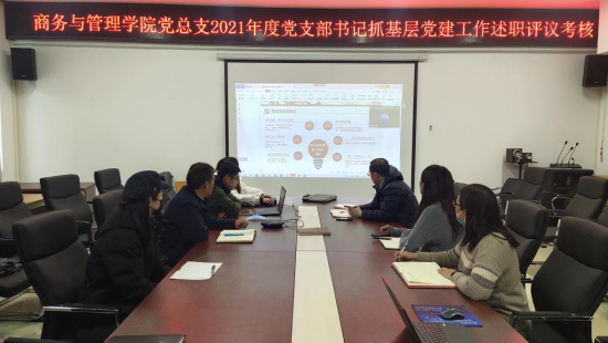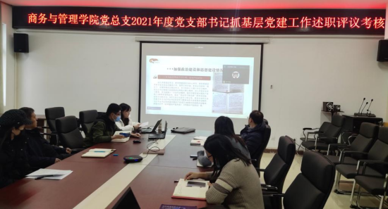 1月5日下午,商务与管理学院党总支在党员活动室召开全体党员大会,学生商务管理支部书记牛钰、教工商务管理支部书记程云翔分别作2021年度述职报告。大会由党总支书记樊建科主持,党总支委员、教工支部委员参加现场评议,其他党员线上听取汇报。