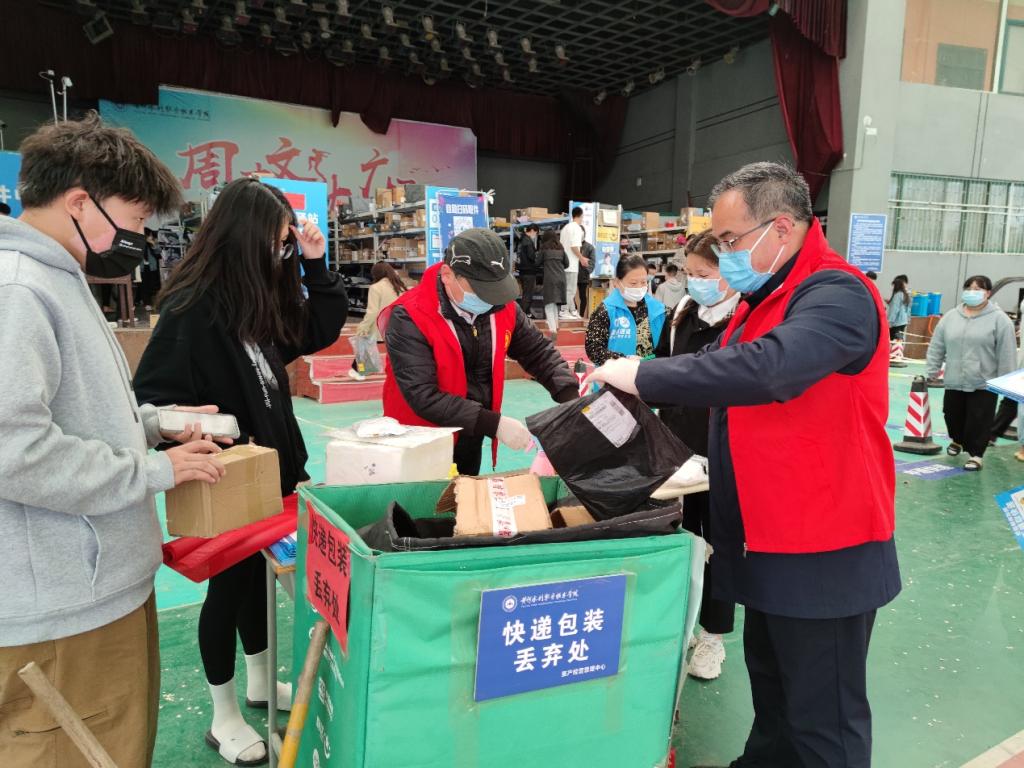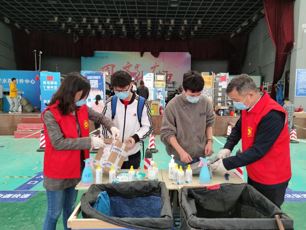 党员志愿服务队向师生发放安全寄递件倡议宣传页和一次性口罩,帮助师生现场拆封快递,并对快件内外、取件学生手部进行全面消杀,并征求学生对校园快递服务的建议。